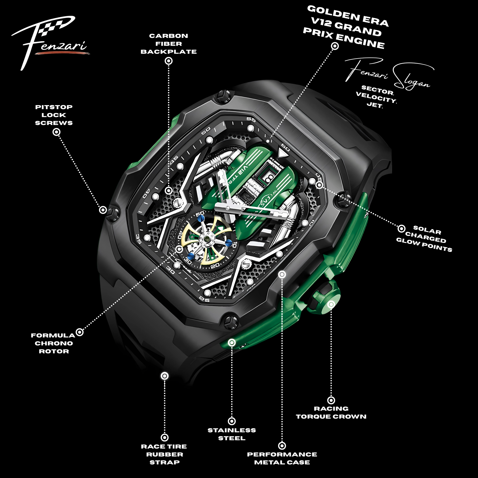Fenzari watches are F1 inspired — a tribute to the era of roaring V12 engines.